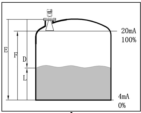 通過輸入空罐高度E(=零點),滿罐高度F(=滿量程)及一些應用參數來設定,應用參數將自動使儀表適應測量環境。對應于4-20mA輸出。