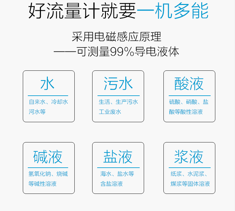 電磁流量計由傳感器和轉(zhuǎn)換器兩部分構(gòu)成。它是基于法拉第電磁感應定律工作的,用來測量電導率大于5μS/cm導電液體的體積流量,是一種測量導電介質(zhì)體積流量的感應式儀表。智能一體電磁流量計除可測量一般導電液體的體積流量外,還可用于測量強酸強堿等強腐蝕液體和泥漿、礦漿、紙漿等均勻的液固兩相懸浮液體的體積流量。