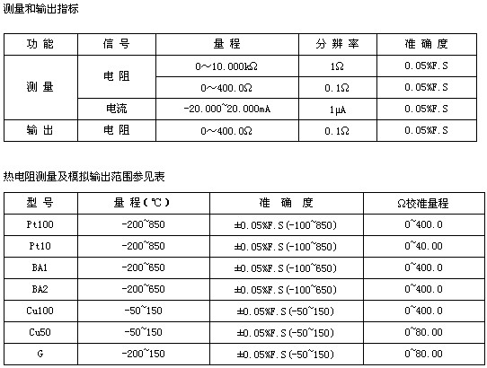 注:精度欄內“溫度范圍”指保證±0.05%F.S的測量范圍,實際測量精度還必須考慮配的熱電阻的誤差。